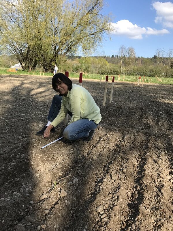 Bei der Aussaat der Sonnenblumenkerne hatten die jüngsten Helfer – die knapp vierjährigen Zwillinge Luise und Tabea – ihren Spaß und legten die Samen nach Vorgabe ihrer Eltern (Elisabeth und Korbinian) in die Furchen.