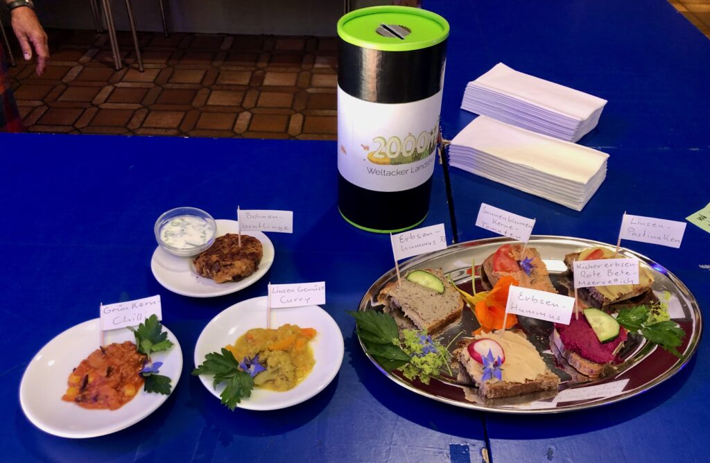 Die Gäste waren jedenfalls begeistert über die große Vielfalt an vegetarischen Köstlichkeiten, die man vor Verzehr hübsch dekoriert auf Mustertellern an der Theke besichtigen konnte.Aber gab nicht nur Nahrung für den Körper, sondern auch für das Hirn: Wir präsentierten Informationen zum Weltacker, zu einzelnen Gemüsen wie Hülsenfrüchten und natürlich präsentierten wir unsere Rezepte. Alles in allem, war es ein schöner Tag. Das Wetter war herrlich – leider haben deshalb viele Bürger.innen einen Abstecher nach Grelmühle und den Badesee der „Klima-Bildungsreise“ in die Alte Kaserne vorzogen. Auf jeden Fall sind wir nächstes Jahr wieder gern mit dabei.