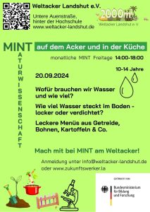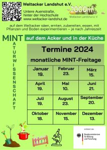 Bei unseren MINT-Aktionen könnt ihr auf dem Weltacker die verschiedenen Ackerkulturen säen, ernten, zubereiten, essen, mit Pflanzen und Boden experimentieren – je nach Jahreszeit immer verschiedene Angebote. Im Winter erkunden wir kurz den Weltacker und kochen und experimentieren dann in einer Küche. Der Mint-Freitag findet einmal pro Monat statt.