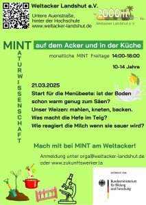 Bei unseren MINT-Aktionen könnt ihr auf dem Weltacker die verschiedenen Ackerkulturen säen, ernten, zubereiten, essen, mit Pflanzen und Boden experimentieren – je nach Jahreszeit immer verschiedene Angebote. Im Winter erkunden wir kurz den Weltacker und kochen und experimentieren dann in einer Küche. Der Mint-Freitag findet einmal pro Monat statt.